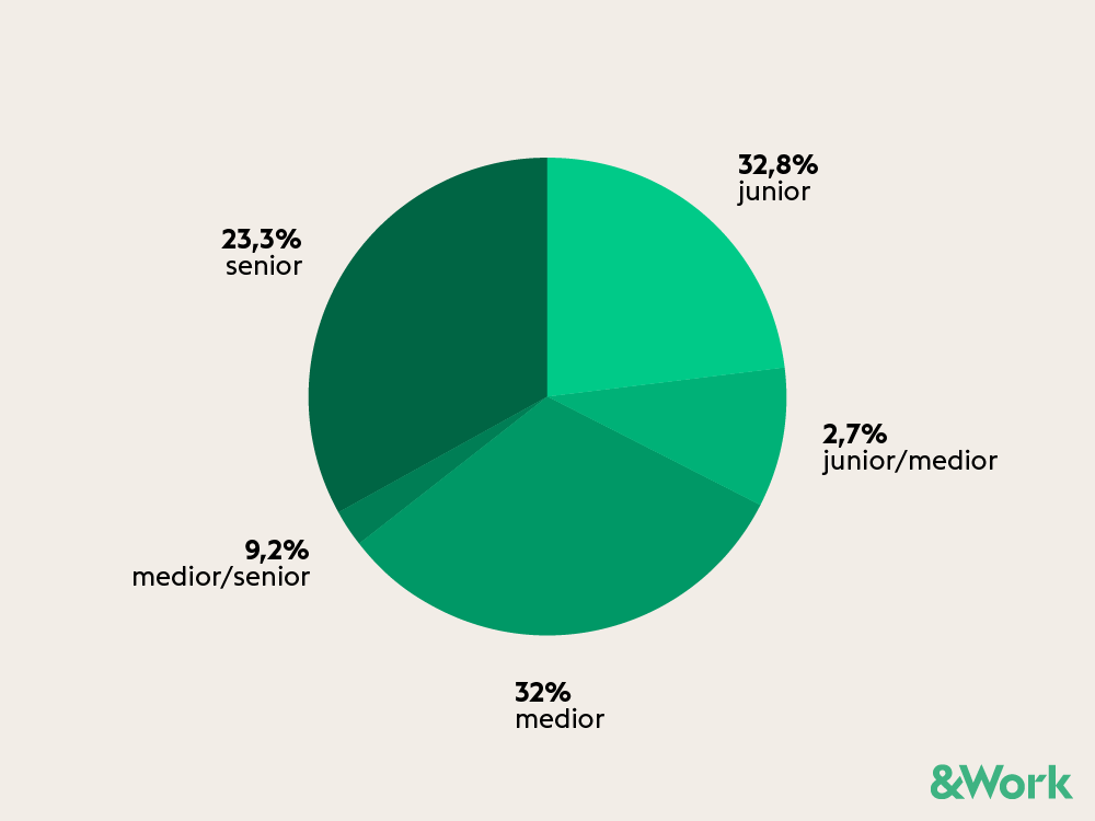 Er zijn geen enorme verschillen tussen het aantal ICT’ers dat reageert op een vacature met junior-, medior- of seniorniveau (afb. 2). ICT-specialisten met weinig werkervaring solliciteren net iets vaker. Het aantal reacties op vacatures waarin gezocht wordt naar ICT’ers met een paar jaar ervaring, is vrijwel gelijk. De meest ervaren specialisten komen op de derde plek, maar blijven niet ver achter.