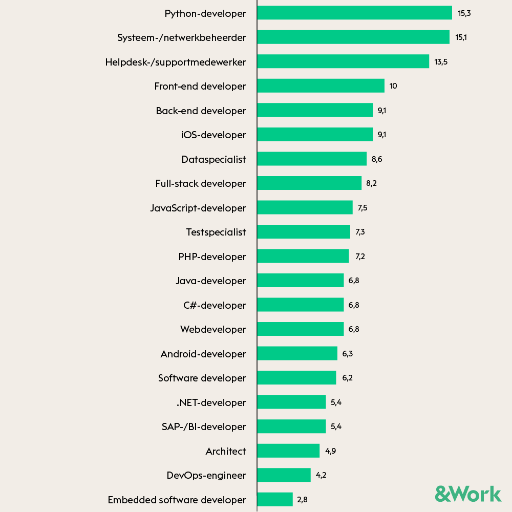 Ben je embedded software developer of architect? Dan weet je dat het met je baankansen goed zit. Als Python-developer of systeembeheerder heb je meer concurrentie. Wat je ook gaat doen en waar je ook gaat solliciteren: laat je niet afschrikken door deze cijfers. Als je goed bent in je vak, kom je echt wel aan de bak.